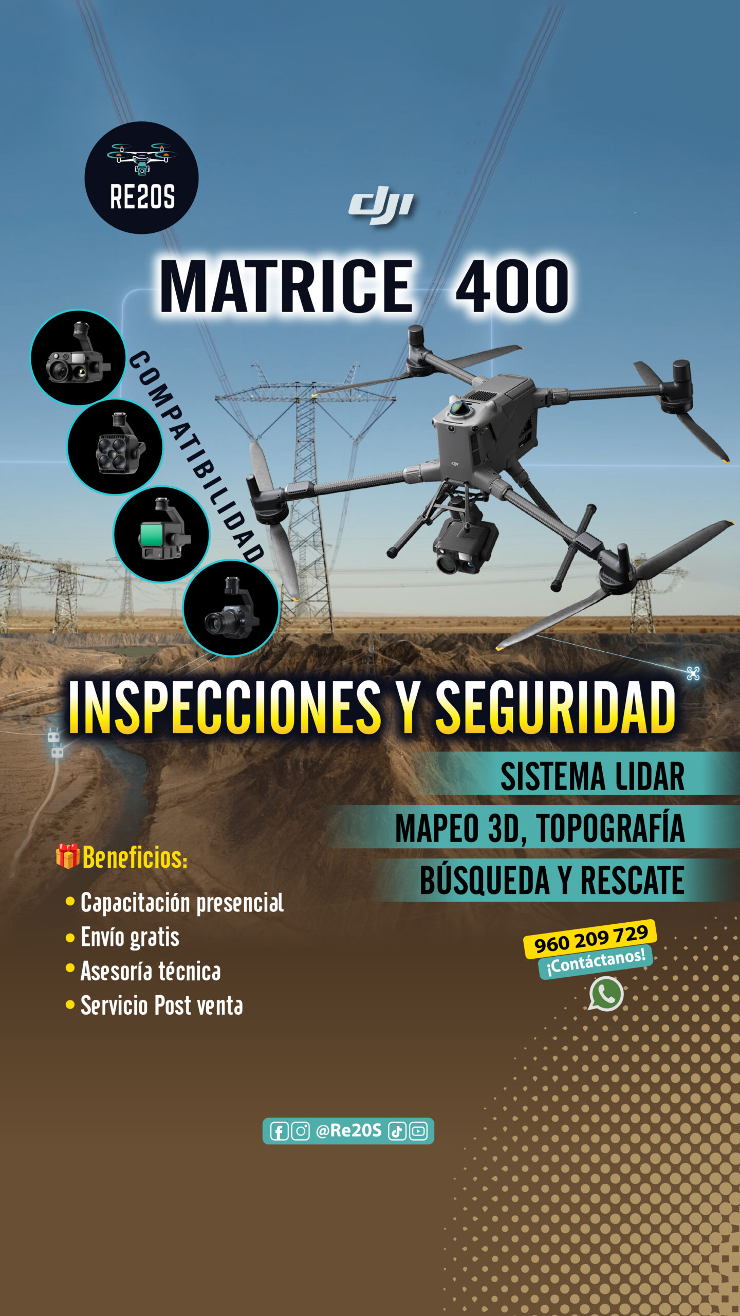 El DJI Matrice 400 RTK es la plataforma insignia diseñada para la excelencia industrial. Combina 59 minutos de vuelo, capacidad de carga de 6 kg, y radar de detección de obstáculos a nivel de líneas eléctricas — ideal para inspección de energía, mapeo y respuesta a emergencias de gran escala.